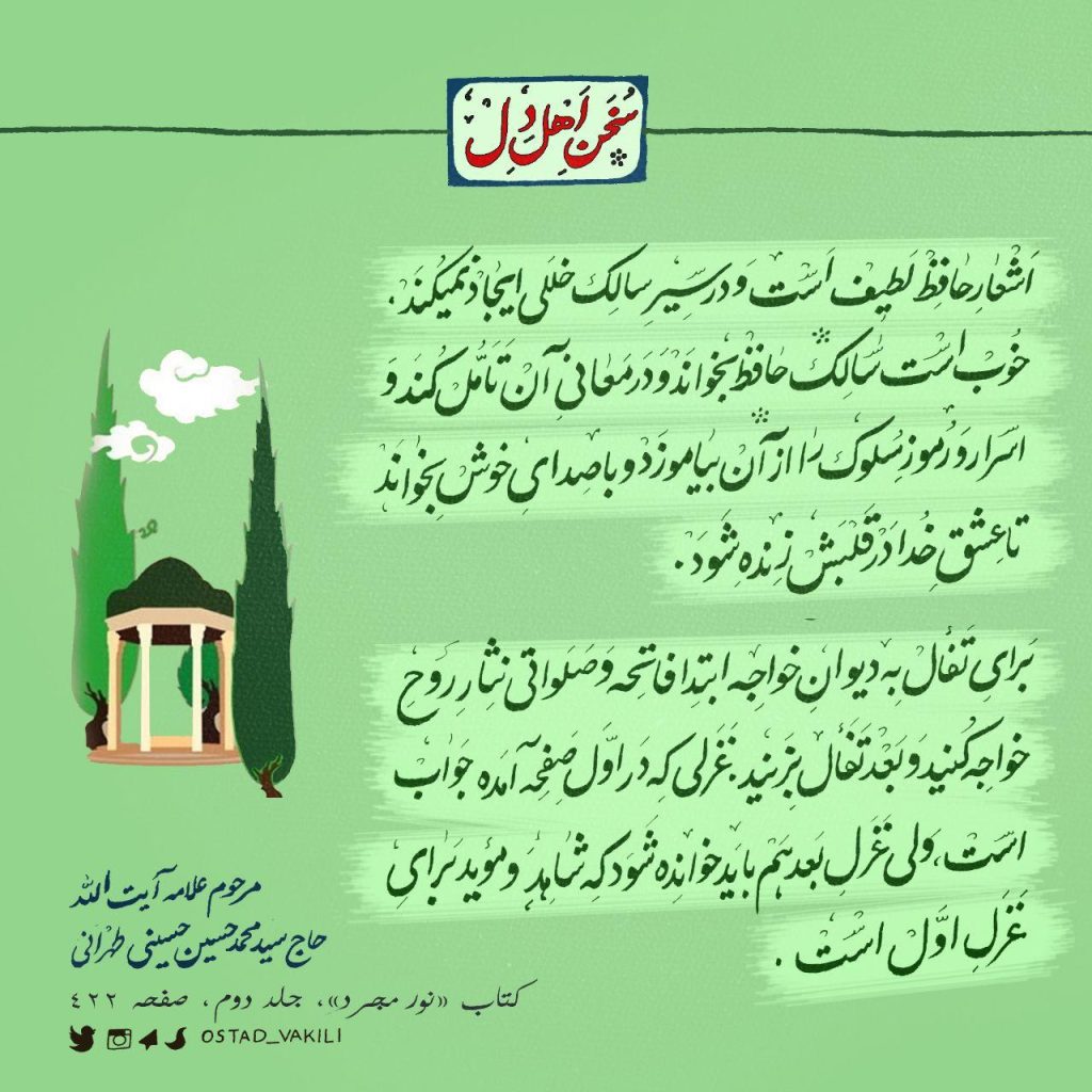 اشعار حافظ لطیف است و در سیر سالِک، خللی ایجاد نمی‌کند. خوب است مسافر راه خدا، حافظ بخواند و در معانی آن تأمل کند و اسرار و رموز سلوک را از آن بیاموزد و با صدای خوش بخواند تا عشق خدا در قلبش زنده شود. برای تفأل به دیوان خواجه حافظ ابتدا فاتحه و […]