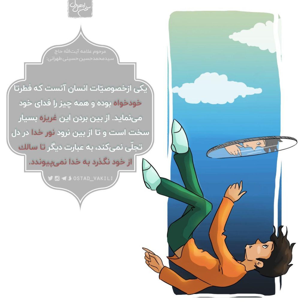 …انسان فطرتاً خودخواه بوده و همه چیز را فداى خود مى‏‌نماید. از بین بردن این غریزه بسیار سخت است و تا از بین نرود نور خدا  در دل تجلّى نمى‏‌کند، به عبارت دیگر تا سالِک از خود نگذرد به خدا نمی‌پیوندد…   مرحوم علامه آیةالله حاج سیدمحمدحسین حسینی طهرانی