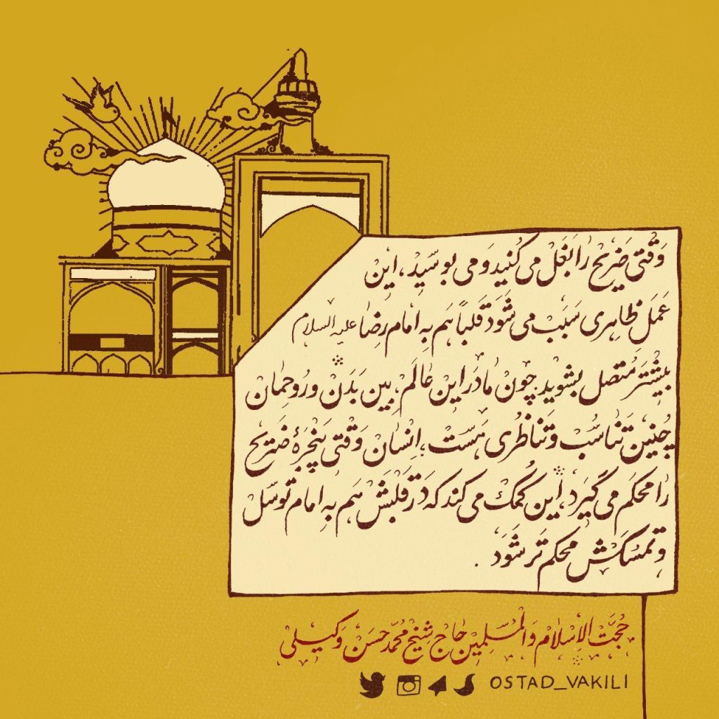 وقتی ضریح را بغل میکنید و میبوسید، این عملِ ظاهری سبب میشود قلباً هم به امام رضا علیهالسلام بیشتر متصل بشوید. چون ما در این عالم، بین بدن و روحمان چنین تناسب و تناظری هست؛ انسان وقتی پنجرهی ضریح را محکم میگیرد، این کمک میکند که در قلبش هم به امام توسل و تمسّکش محکمتر شود.